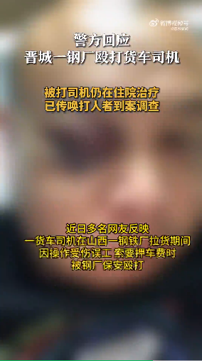 10月26日,山西晋城,多名网友反映,一货车司机在山西一钢铁厂拉货期间,被掉落货物擦伤就医,隔天返工继续运货时发现货物已被拉走,于是向钢厂索要误工相关费用,遭到钢厂保安殴打。相关病例显示,该货车司机右侧上颌骨颌突骨折。辖区派出所回应,已受理该案件,并传唤涉案人员调查,被打货车司机仍在住院接受治疗。...