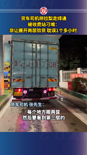 10月25日,一货车司机在社交平台发布视频爆料称,自己拉梨走绿通被收费站人员刁难,非让搬开两层验货,耽误1个多小时。据卡友介绍,自己拉了一车梨要走绿通,收费站工作人员却要求司机自己将两层货品搬运卸下,配合检查,否则不予放行。卡友认为,收费站查验绿通货物无可厚非,但这是收费站的责任,相关规定并没有要求司机去搬卸货物。僵持了将...