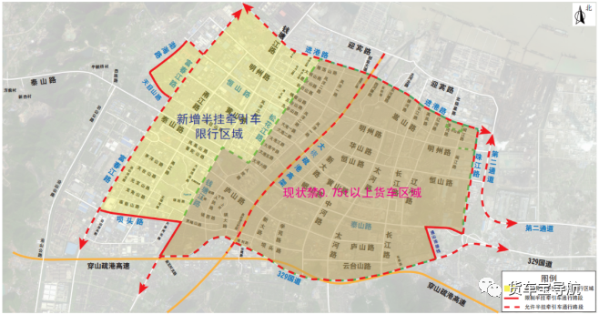 顺时针由进港路——珠江路——泰山路——通山连接线——329国道——钱塘江路——坝头路——富春江路——天目山路——渤海路——恒山路——富春江路合围而成的封闭圈内地面道路限制半挂牵引车辆通行。其中边界道路泰山路、通山连接线、钱塘江路、坝头路、天目山路、渤海路限制半挂牵引车辆通行,其他边界道路及大碶疏港高架允许半挂牵引车辆通行。
