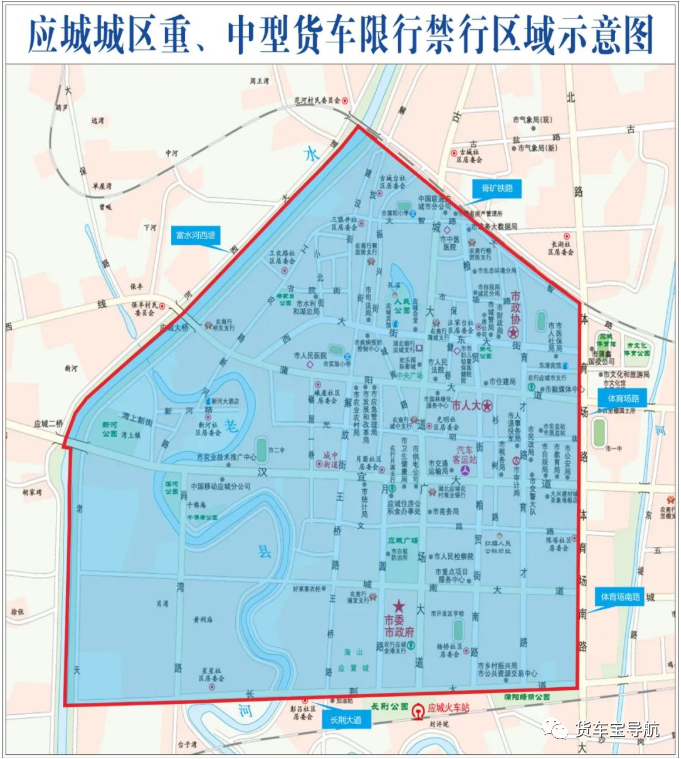 一、重、中型货车限行区域:膏矿铁路以南,富水河西堤以东,长荆大道以北,体育场路和体育场南路以西所围区域内所有道路(不含体育场路和体育场南路)。