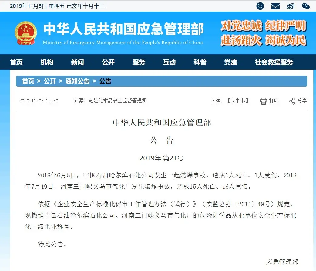 2019年6月5日,中国石油哈尔滨石化公司发生一起燃爆事故,造成1人死亡、1人受伤。2019年7月19日,河南三门峡义马市气化厂发生爆炸事故,造成15人死亡、16人重伤。