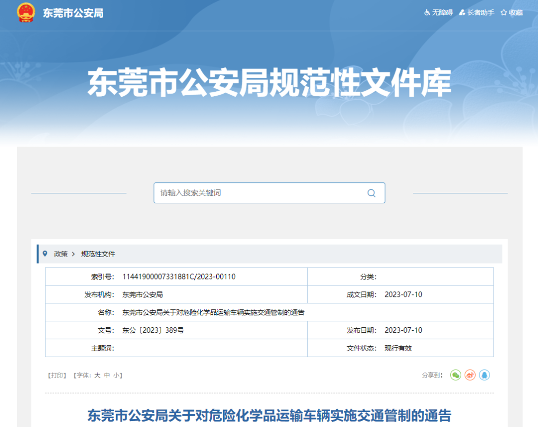 东莞市公安局关于对危险化学品运输车辆实施交通管制的通告