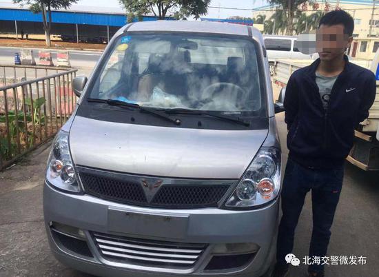 这时,从北海开往合浦方向驶来一辆未悬挂号牌的面包车,开开停停、形迹可疑,民警立即上前将其拦下检查。