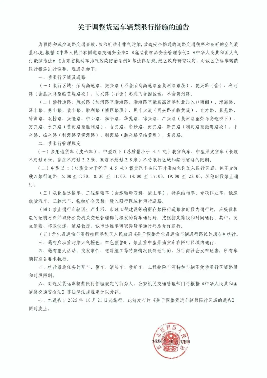 为预防和减少道路交通事故、防治机动车排气污染,营造安全畅通的道路交通秩序和良好的空气质量环境,根据《中华人民共和国道路交通安全法》《危险化学品安全管理条例》《中华人民共和国大气污染防治法》《山东省机动车排气污染防治条例》等法律法规,经区政府研究决定,对垦利城区货运车辆禁限行措施进行调整。现通告如下: