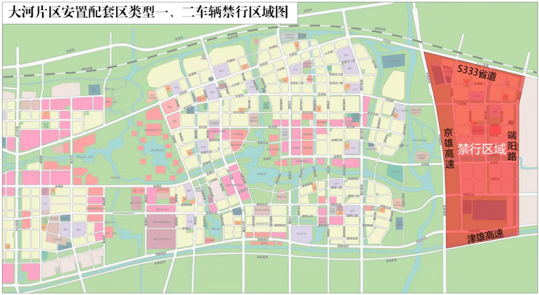 类型一、二车辆禁行区域:京雄高速(不含)以东,S333省道(不含)以南,端阳路(含)以西,津雄高速(不含)以北的合围区域内所有市政道路。
