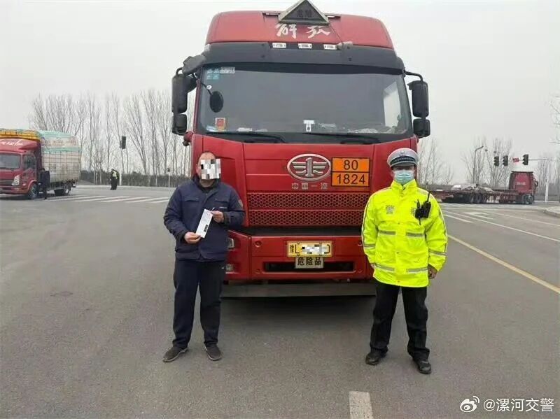 1月25日16时13分,河南漯河开发区樟江东路与韶山路口,一辆运输危化品的重型半挂车无视交通信号灯,在红灯亮起时仍快速通过路口,正在附近执勤的漯河交警四大队民警发现后将其拦停。