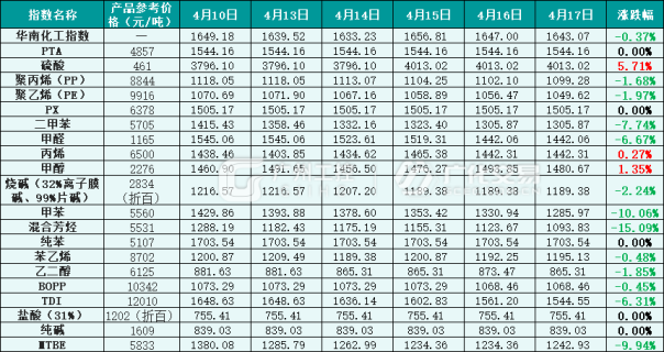 国内市场来看,上周,国内化工品市场震荡整理为主。周内,地缘局势溢价有所消退,国际原油价格承压下跌,对国内化工品成本支撑弱化,其中原油关联度较高的品种跌幅更为显著,如:混合芳烃、甲苯、MTBE、二甲苯等。硫酸市场则表现强势,受原料硫磺供应收紧、酸厂集中检修等利好支撑,价格持续走高,成为化工品市场的上涨主力。其余化工品种虽受需求疲软压制而震荡下跌,但相比原油关联品种抗跌性更强。整体市场呈现跌多涨少、强弱分化明显格局。据广化交易监测数据,截至4月17日,华南化工产品价格指数(下称“华南化工指数”)为1643.07点,环比上周同期下跌0.37%。20个分类指数中,硫酸、甲醇、丙烯共3个指数上涨;混合芳烃、甲苯、MTBE、二甲苯、丙烯、甲醛、TDI、烧碱、PE、乙二醇、PP、BOPP共12个指数下跌;其余指数则保持稳定。