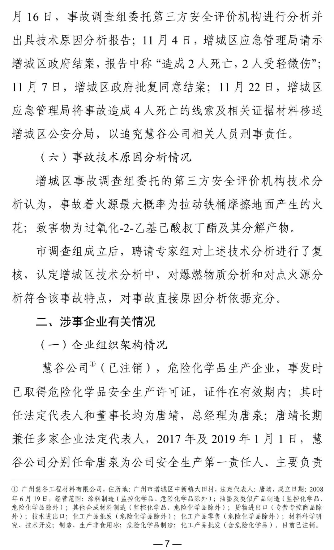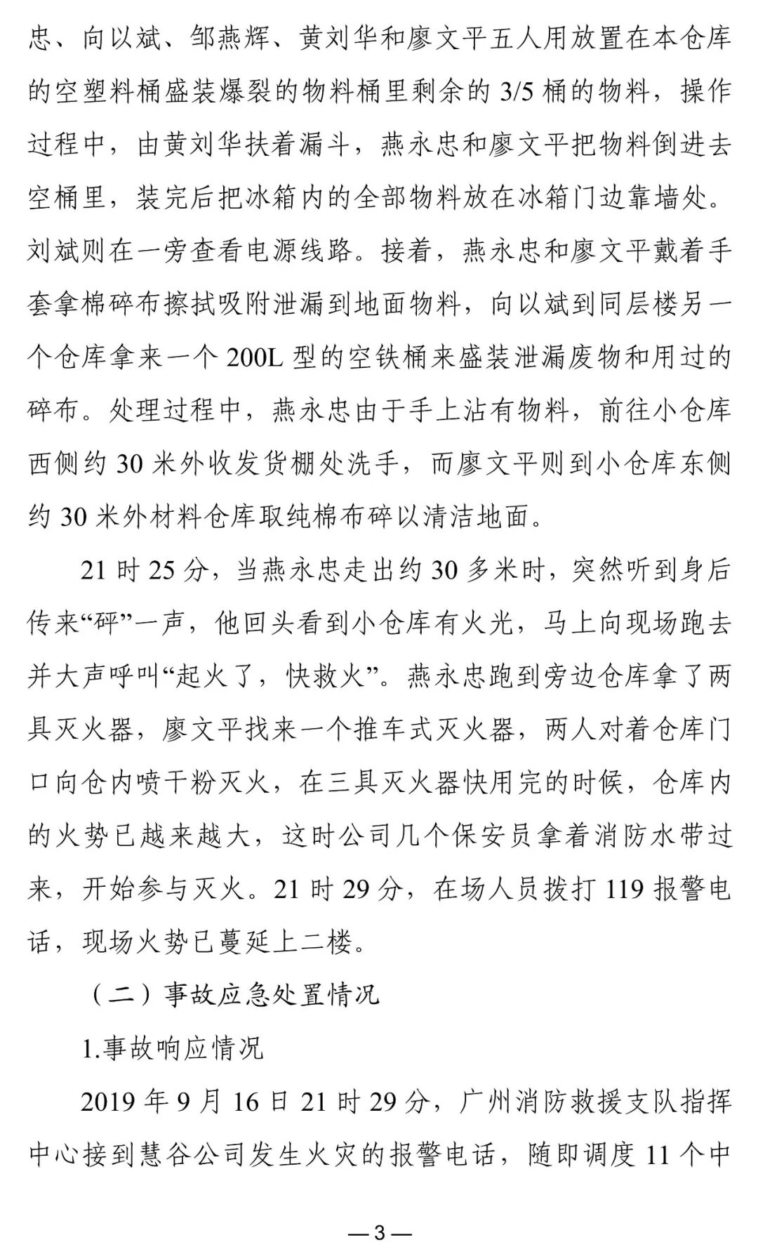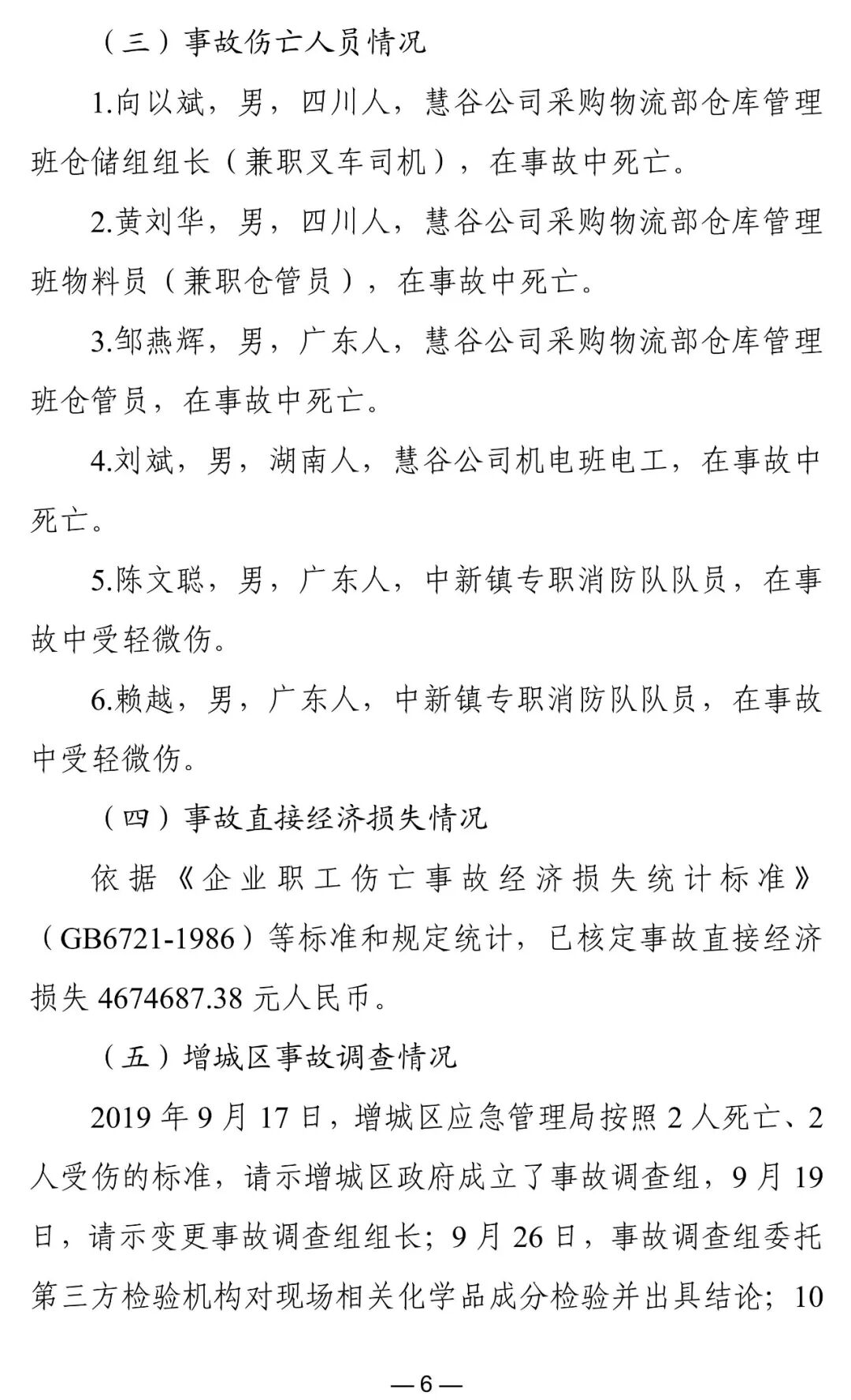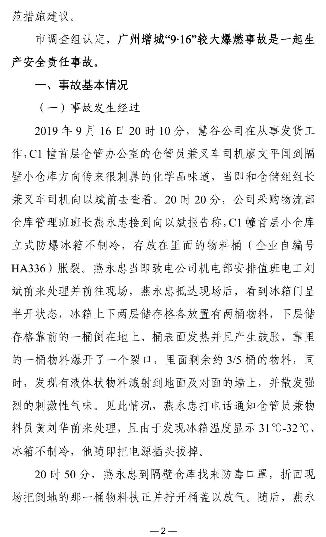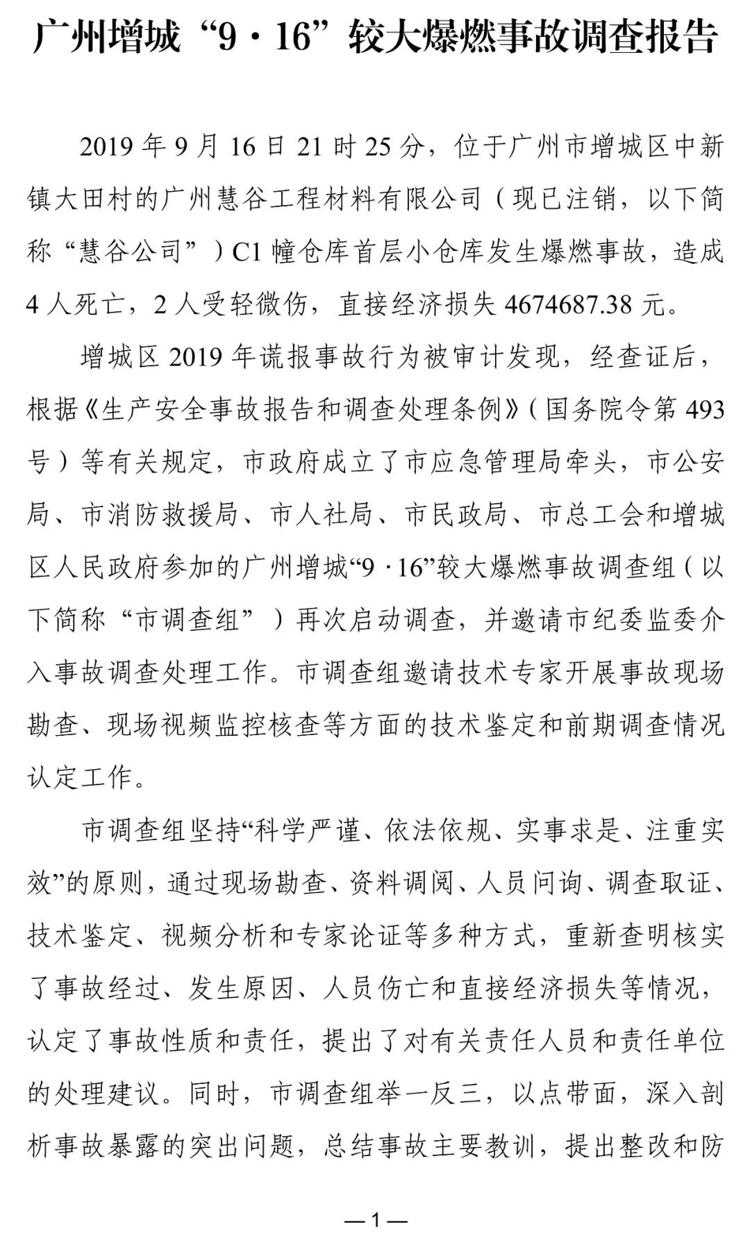 2019年9月16日21时25分,位于广州市增城区中新镇大田村的广州慧谷工程材料有限公司(现已注销,以下简称“慧谷公司”)C1幢仓库首层小仓库发生爆燃事故,造成4人死亡,2人受轻微伤,直接经济损失4674687.38元。
