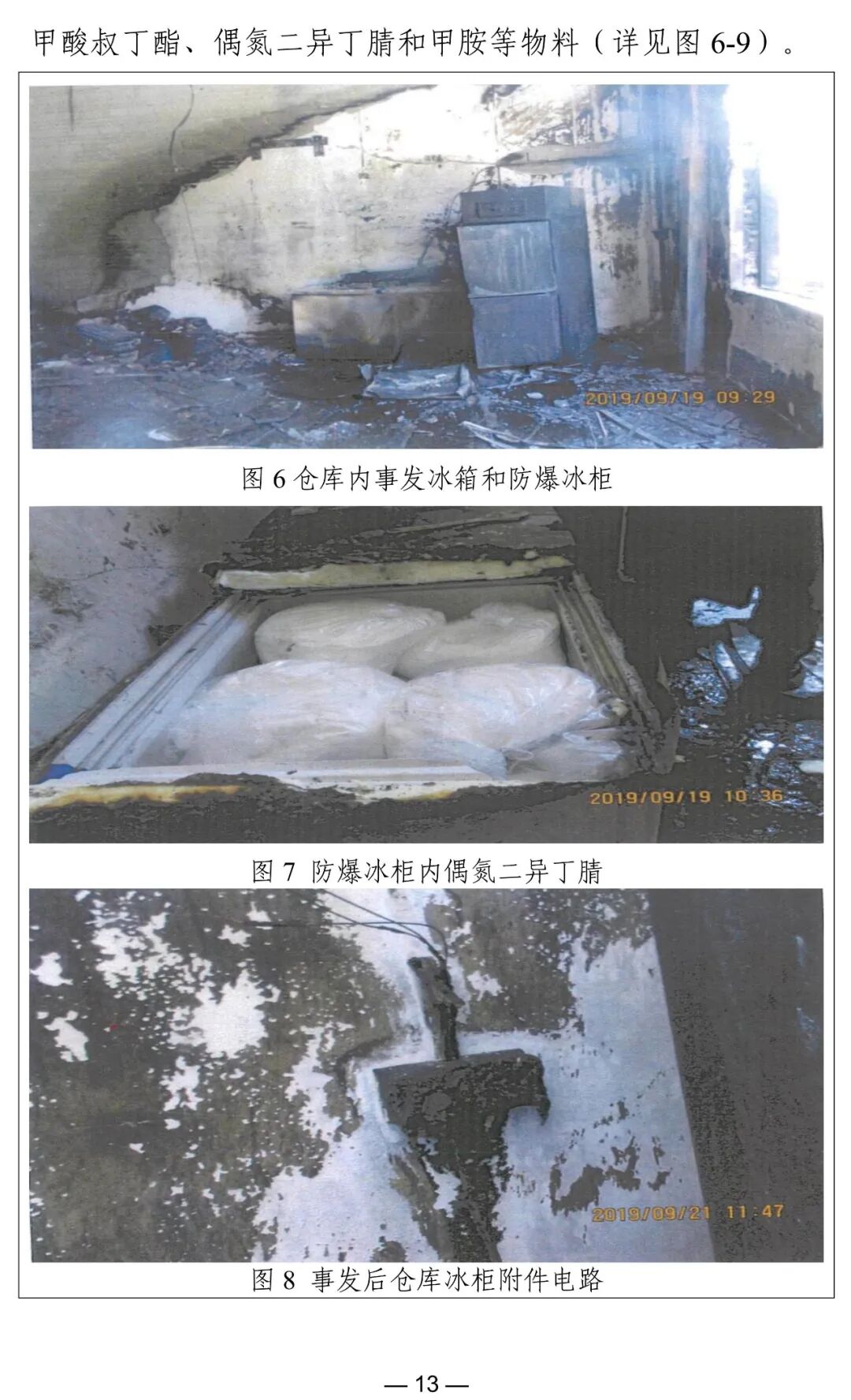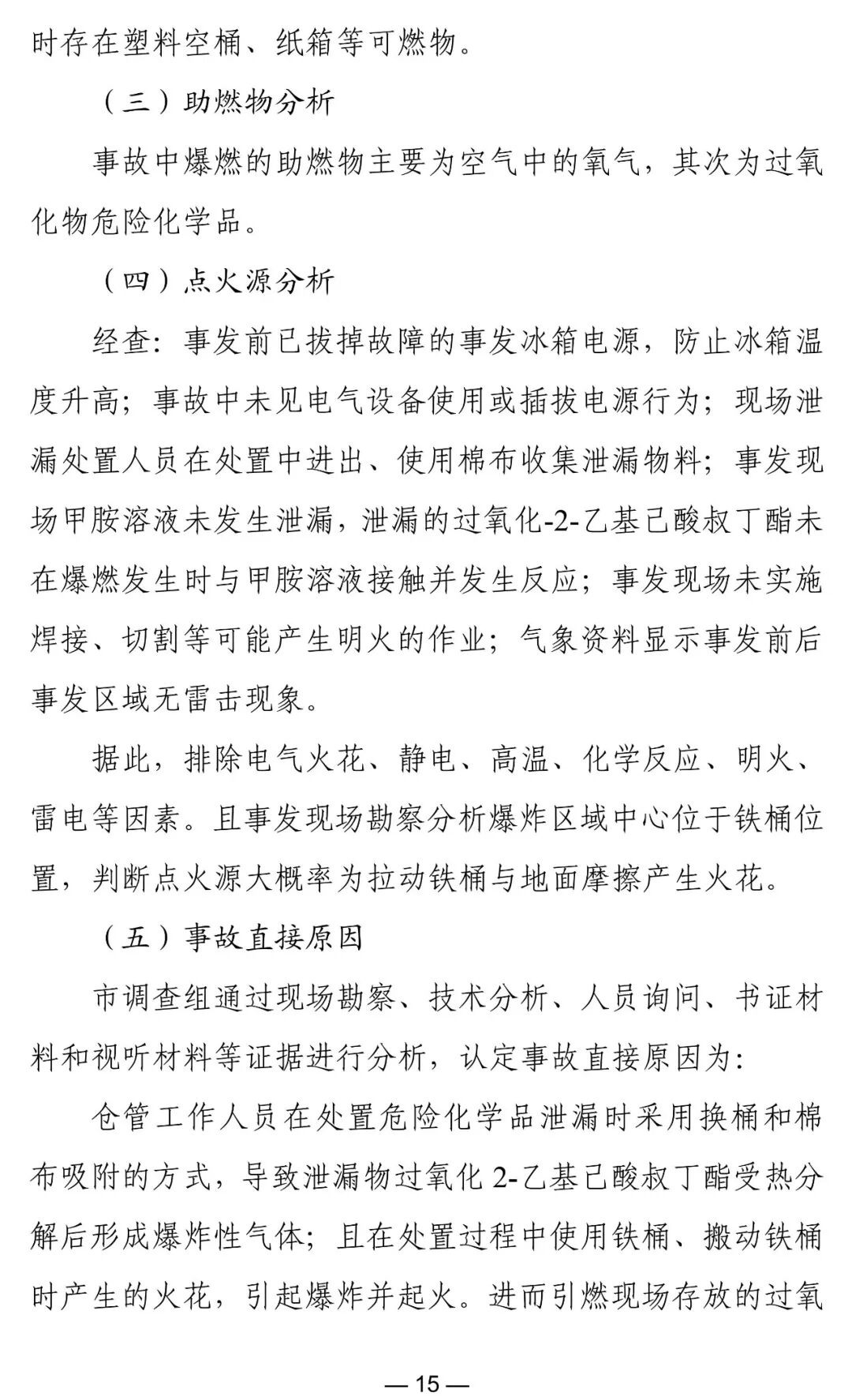 仓管工作人员在处置危险化学品泄漏时采用换桶和棉布吸附的方式,导致泄漏物过氧化2-乙基己酸叔丁酯受热分解后形成爆炸性气体;且在处置过程中使用铁桶、搬动铁桶时产生的火花,引起爆炸并起火。进而引燃现场存放的过氧苯甲酸叔丁酯、过氧化-2-乙基己酸叔丁酯、偶氮二异丁腈、甲胺溶液等危险化学品和空塑料桶等,造成现场火势迅速蔓延并引发多次爆燃。
