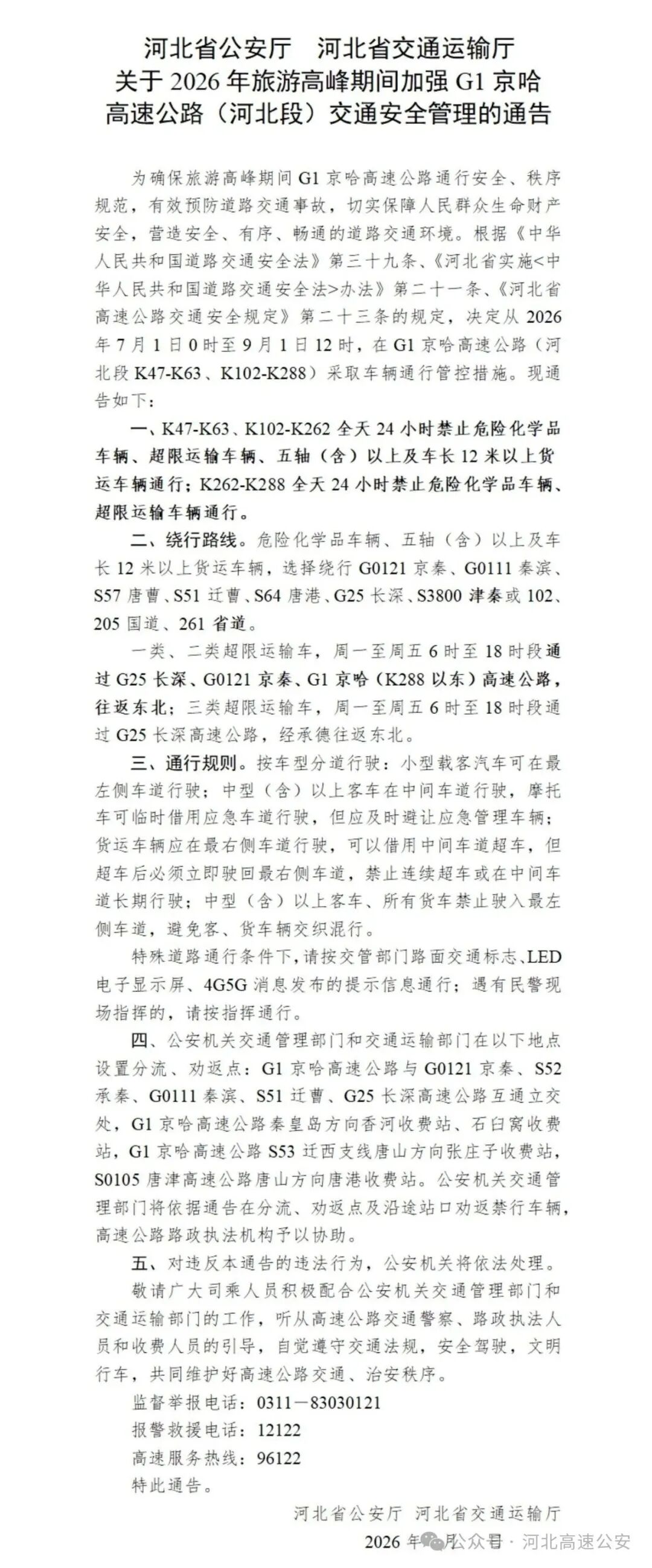 为进一步加强和改进今年夏季旅游高峰期间G1京哈高速公路的交通管理工作,进一步优化提升安全、有序、畅通的道路交通环境,现拟发布《河北省公安厅 河北省交通运输厅关于2026年旅游高峰期间加强G1京哈高速公路(河北段)交通安全管理的通告》,公示如下: