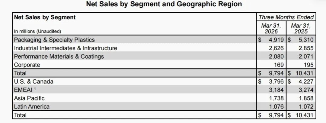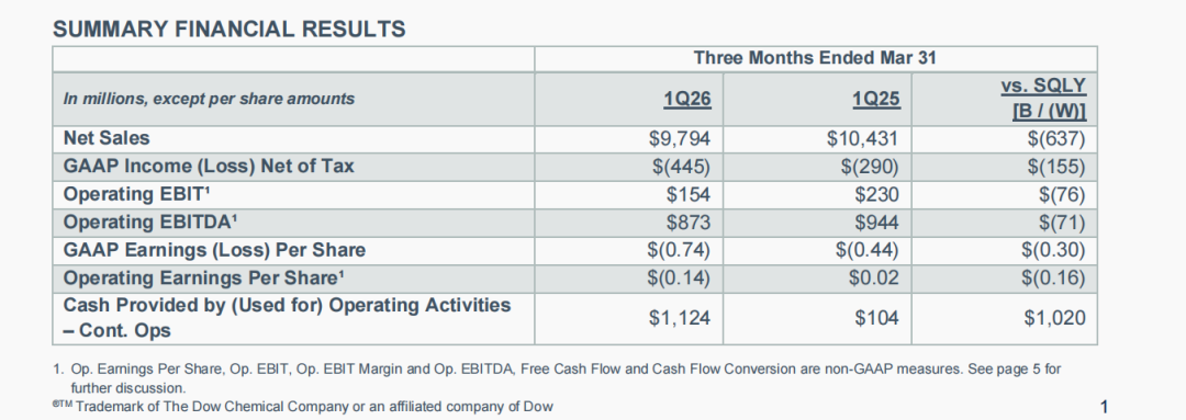 4月23日,陶氏公告2026年一季度业绩,净销售额97.94亿美元(约合人民币669.42亿元),同比下降6%;净亏损4.45亿美元(约合人民币30.40亿元);Op. EBIT 1.54亿美元,同比下降7600万美元,这主要是由于价格下跌所致;持续经营活动产生的现金11亿美元,同比大涨10亿美元,主要得益于收到NOVA Chemicals的法律诉讼赔款。
