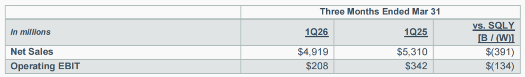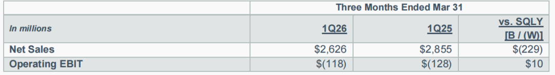 净销售额26亿美元,同比下降8%;Op. EBIT减亏,同期增长1000万美元。