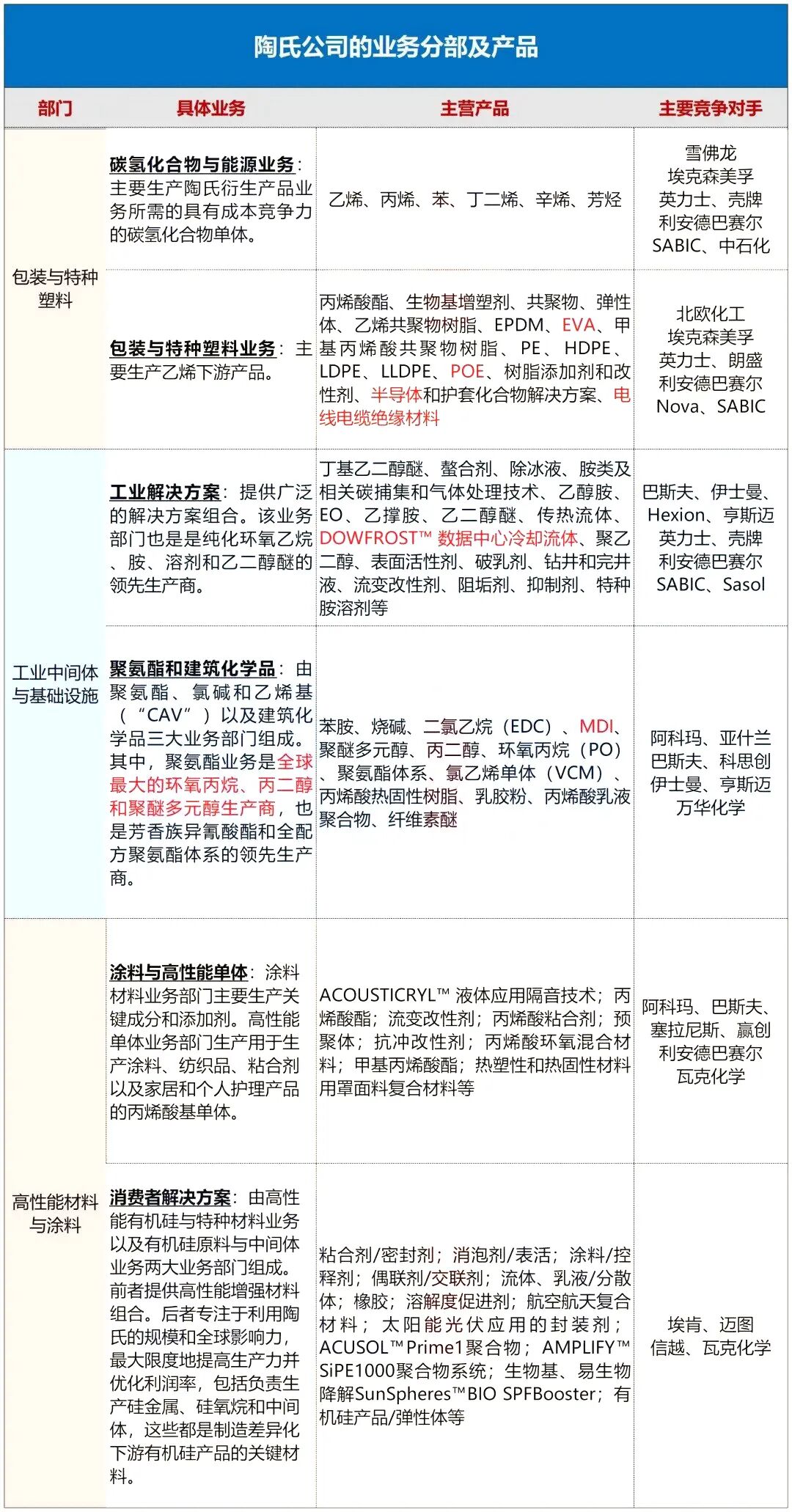 从业务上看,陶氏公司主营3大业务部,主要涉及乙烯及乙烯下游、环氧树脂、聚氨酯、丙烯酸及酯、有机硅等产品链,如图所示(点击放大):