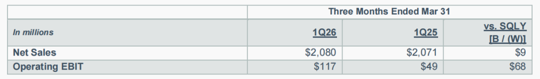 该净销售额为21亿美元,与去年同期持平;Op. EBIT 1.17亿美元,较上年同期增长6800万美元。
