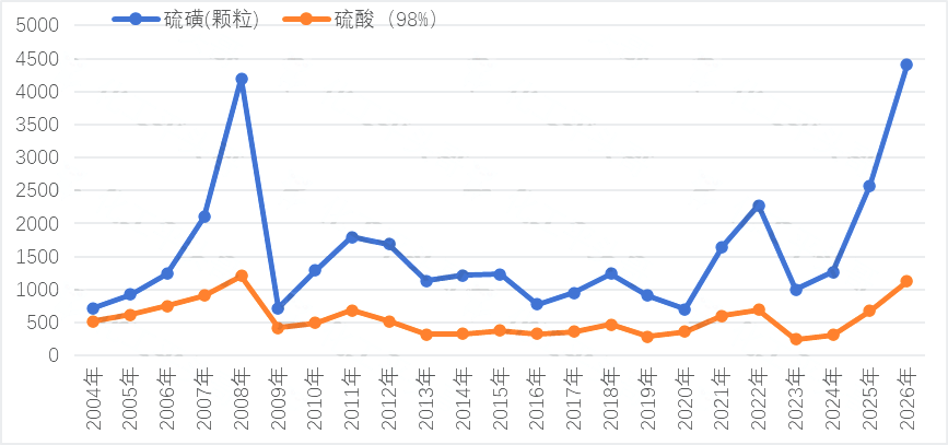 根据相关统计来看,截至2026年4月中旬,中国硫磺市场在2026年的年度平均价格已经超过4400元/吨,创造了过去23年的历史新高。硫酸年度平均价格也超过了1100元/吨,即将超过2008年的1200元/吨历史高点。