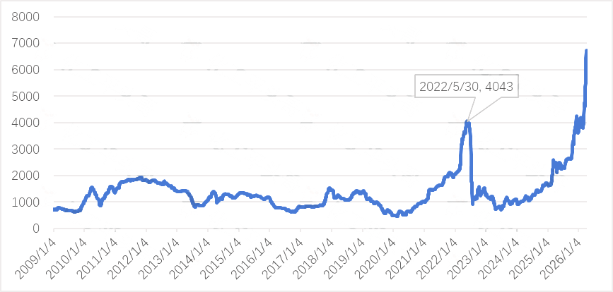 按照日均价格,从2009年至2026年4月的硫磺价格走势看,目前硫磺市场价格也已成为历史高点。截至2026年4月中旬,中国硫磺市场价格已经突破6700元/吨,而且市场仍有继续上行的动力。