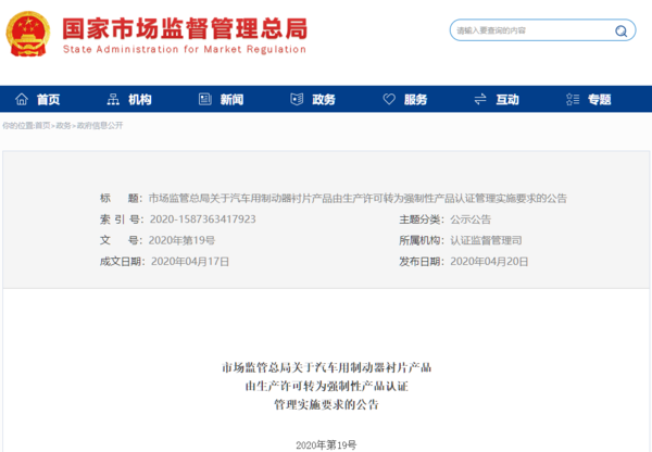 日前,国家市场监督管理总局在其官网上发布公开信息,自2020年6月1日起,汽车用制动器衬片将纳入CCC认证管理范围,将汽车用制动器衬片由之前的生产许可管理,转为强制性(CCC)认证管理。
