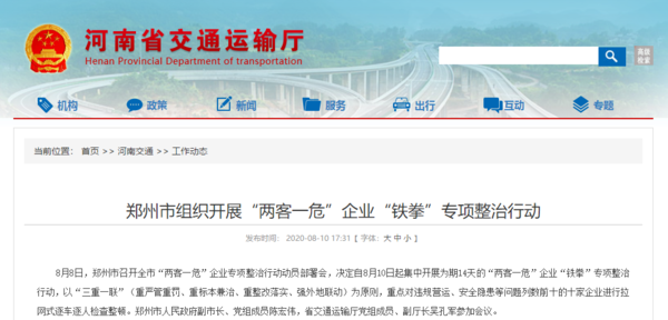目前,郑州市已经针对该项《通知》展开行动。据悉,自8月10日起郑州全市开展为期14天的“两客一危”企业“铁拳”专项整治行动。