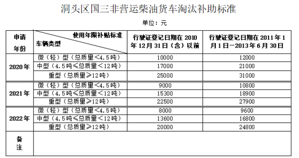 近日,温州洞头市制定了《洞头区国三非营运柴油货车淘汰补助实施方案》,根据车辆的使用年限和淘汰年限,车主淘汰国三非营运柴油货车最高可获得24800元补贴!