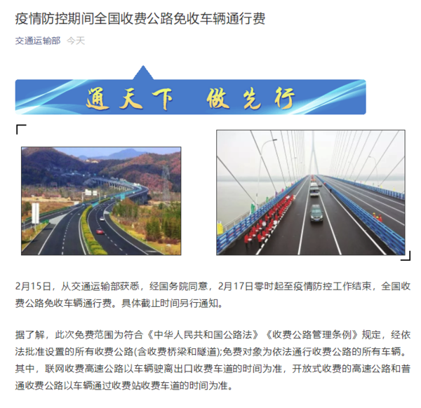 根据党中央、国务院的决策部署,目前全国人民正在众志成城、全力以赴打赢新冠肺炎疫情防控人民战争、总体战、阻击战,推进企业复工复产。经国务院同意,各地交通运输主管部门和收费公路经营管理单位先后两次延长小型客车重大节假日免费通行政策。