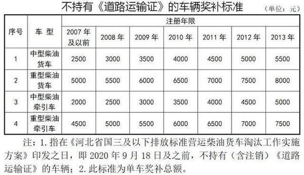 重型车辆奖补标准高于中型车辆,货车奖补标准高于牵引车,注册年限较新的车辆奖补标准较高,持有《道路运输证》的车辆奖补标准较高,在2020年10月底前报废注销的车辆奖补标准较高。