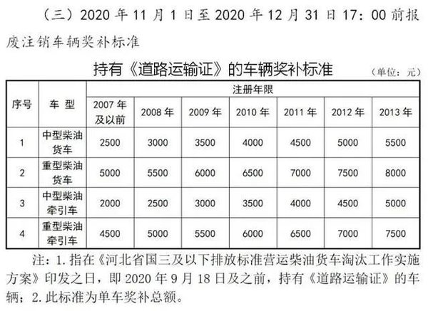 1、2020年提前淘汰国三及以下排放标准营运柴油货车财政奖补政策执行时间为2020年5月8日(以机动车回收日期为准)至2020年12月31日(以机动车注销日期为准)。