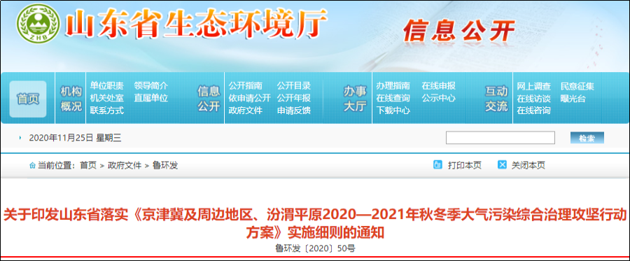 11月23日,山东省生态环境厅发布关于落实《京津冀及周边地区、汾渭平原2020—2021年秋冬季大气污染综合治理攻坚行动方案》实施细则的通知。要求:强化即日起到2021年3月31日期间的大气污染防治工作,济南、淄博、济宁、德州、聊城、滨州、菏泽市7个传输通道城市完成阶段性目标,其他9个非传输通道城市达到相应年度空气质量改善目标。