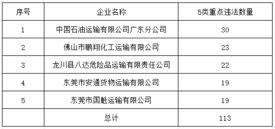 期间,全省5家运输企业所属的危化品运输车辆被交警部门查处5类重点交通违法行为相对较多: