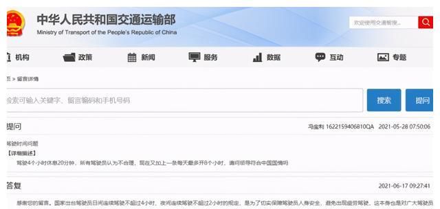 最近,我们在交通运输部官方网站上,看到了卡友们对4小时休息规定不合理,与“8小时工作制”不合理的相关提问。问题称:“驾驶4个小时休息20分钟,所有驾驶员认为不合理,现在又加上一条每天最多开8个小时,请问领导符合中国国情吗”面对这样的问题,我们也看到了官方的回复,运输服务司在网页上回复称: