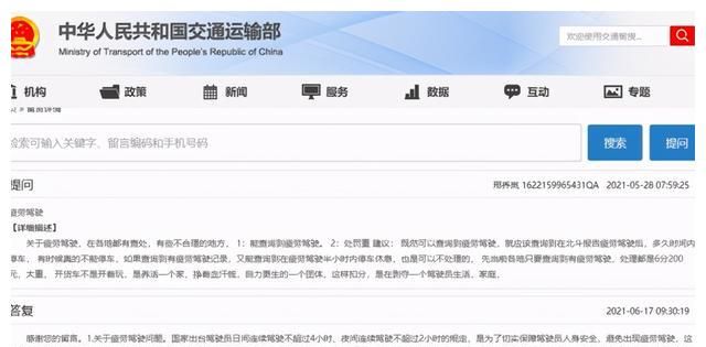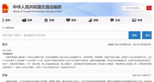 而遇到这些问题之后,卡友们虽然很冤枉,因为并不是自己不想休息,而是客观条件不允许,但罚款并不能“打折”。所以,有很多卡友开始质疑起了这项规定的合理性。而交通运输部网站上,我们也看到了一些网友的提问,当然我们也看到了运输服务司的回答。
