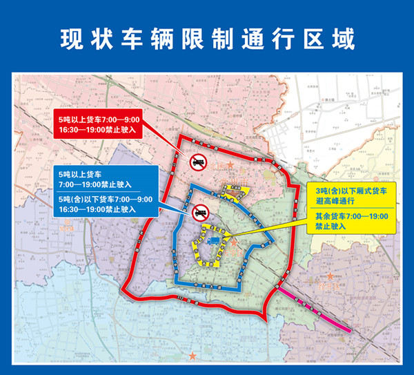 (1)全天禁止大型公路客运车辆、危险化学品运输车、专项作业车、轮式专用机械车、三轮汽车、低速货车、拖拉机通行。摩托车限制通行区域和时间不变。
