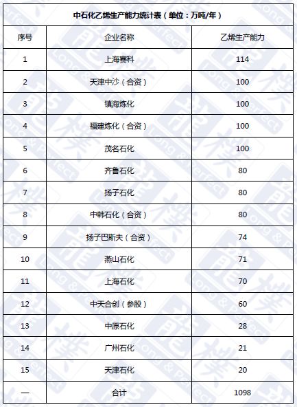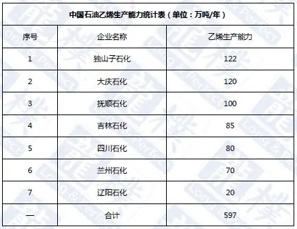 截止2018年底,中石油拥有7套乙烯装置,总产能597万吨/年,占比全国乙烯产能24%。
