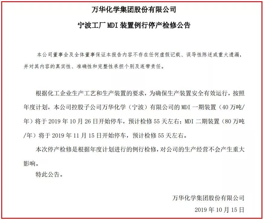 根据化工企业生产工艺和生产装置的要求,为确保生产装置安全有效运行。按照年度计划,本公司控股子公司万华化学(宁波)有限公司的MDI一期装置(40万吨/年)将于2019年10月26日开始停车,预计检修55天左右;MDI二期装置(80万吨/年)将于2019年11月15日开始停车,预计检修55天左右。