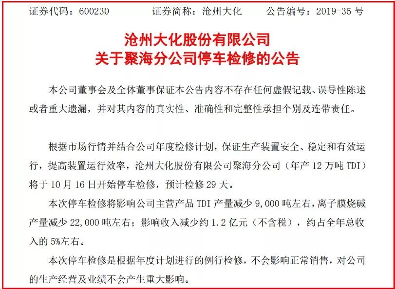 根据市场行情并结合公司年度检修计划,保证生产装置安全、稳定和有效运行,提高装置运行效率,沧州大化股份有限公司聚海分公司(年产12万吨TDI)将于10月 16日开始停车检修,预计检修29天。