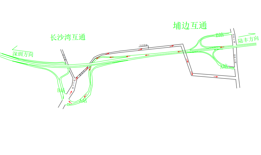 示意图1(推荐路线):沈海高速长沙湾互通出口左转香江大道西掉头→长沙湾收费站汕头方向入口→沈海高速→埔边互通出口